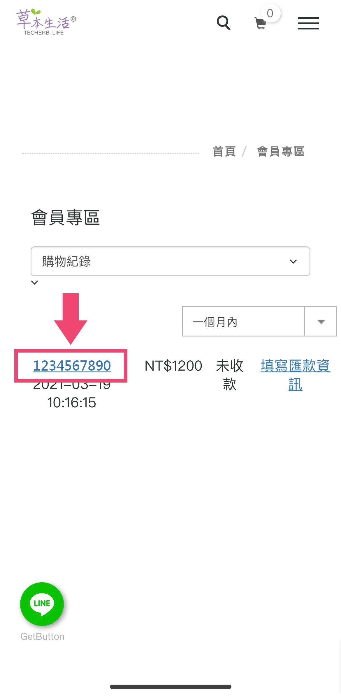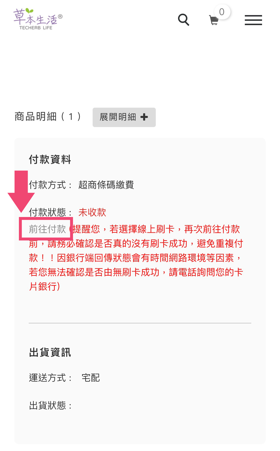 請登入並點擊「我的帳號]-從基本資料的下拉選單選取「購物紀錄」-點擊「訂單編號」流水碼-在商品明細裡面點擊「前往付款」-在付款方式介面最下面即可找到「取得繳費條碼」