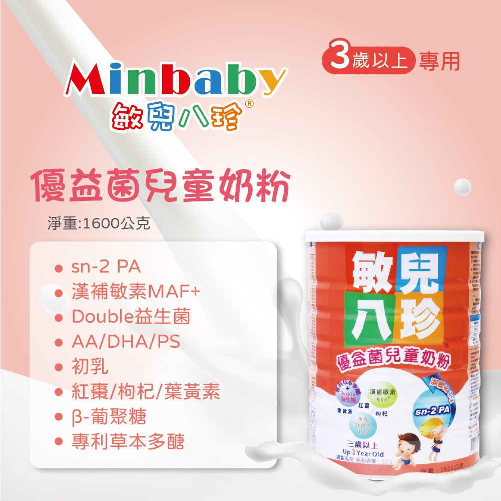 敏兒八珍 優益菌兒童奶粉(3歲以上適用)-sn-2 PA/雙重益生菌/MAF+草本配方