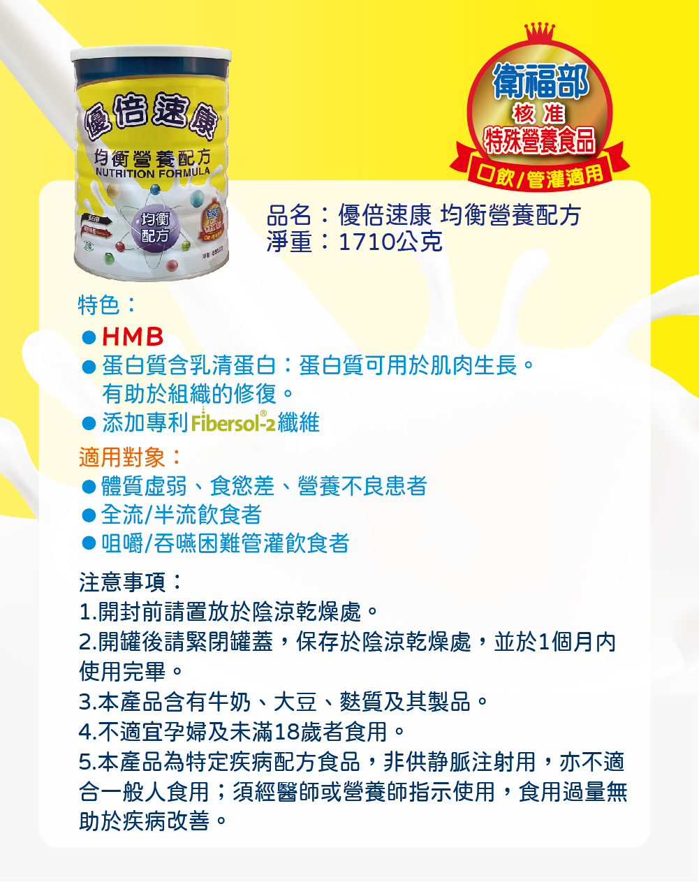 大容量-優倍速康 均衡營養配方1710g(管灌適用/HMB/膳食纖維)