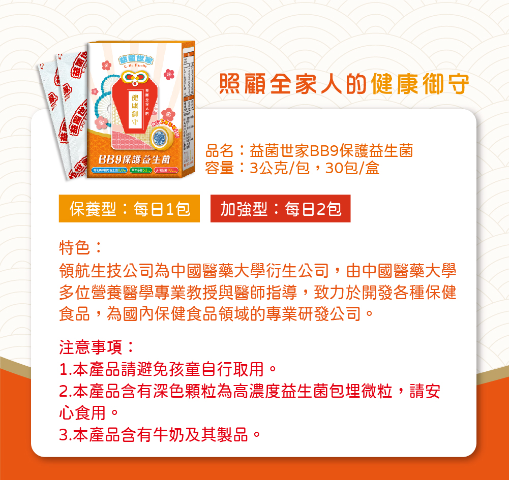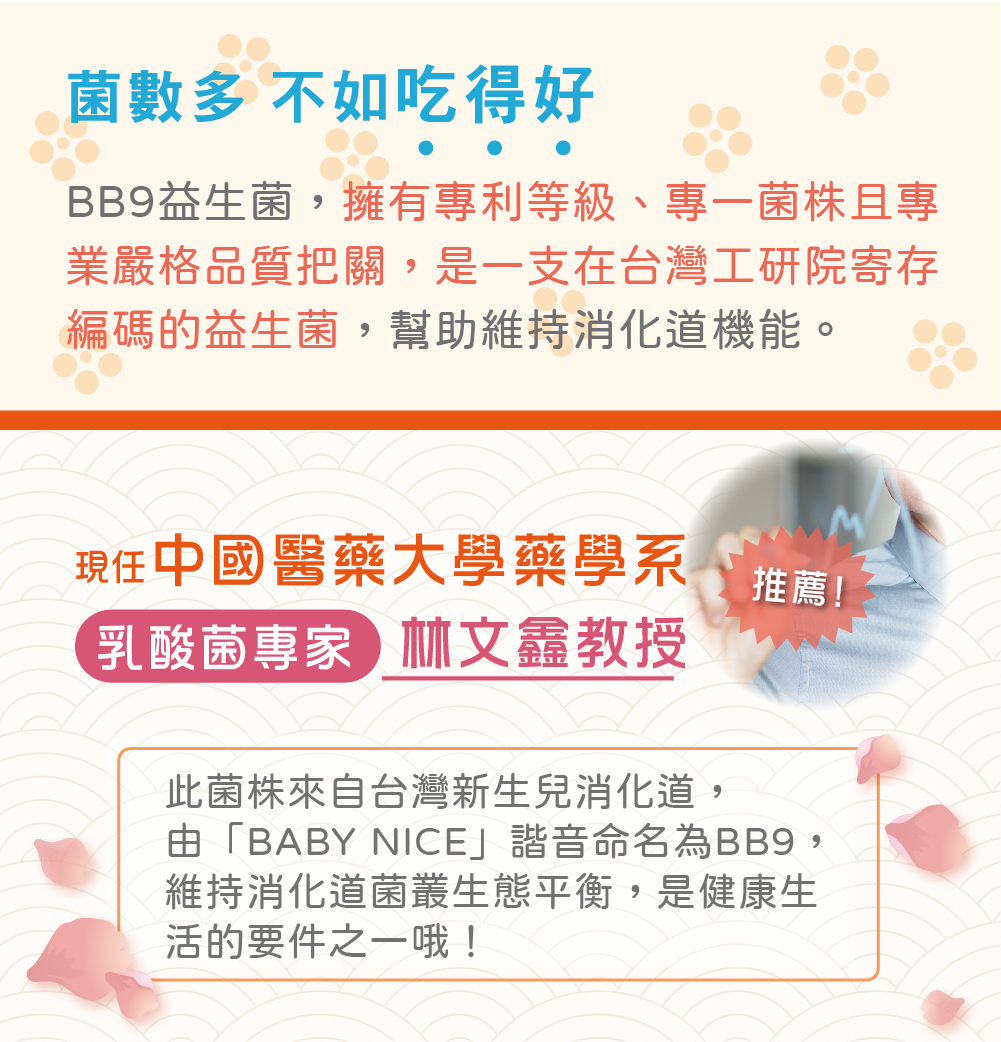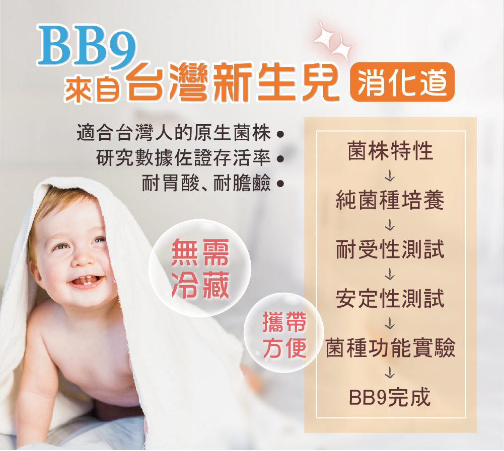 - 由中國醫藥大學-林教授專業團隊研發,成功以高科技分離技術,篩選出Lactobacillus Plantarum BB9,是一支在台灣工研院寄存編碼的益生菌。